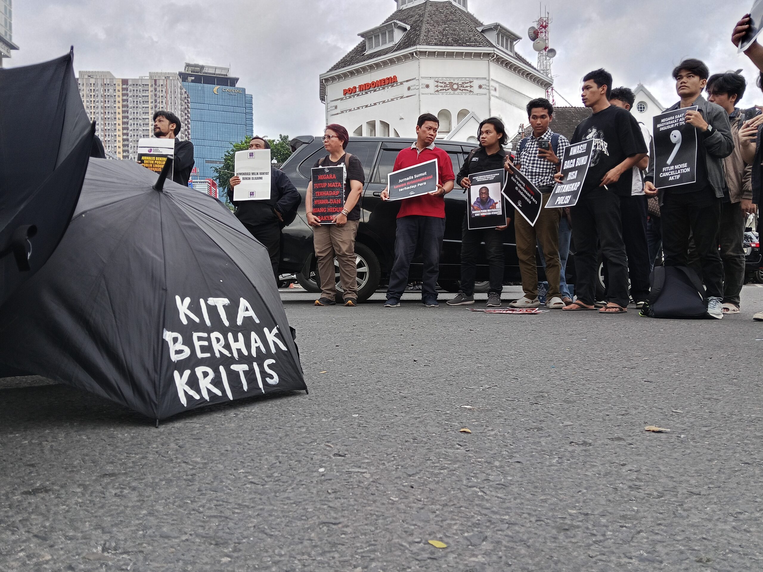 Sejumlah aktivis dari Kamisan Medan, jurnalis lintas media serta Komite Keselamatan Jurnalis (KKJ) Sumatera Utara turut membentuk solidaritas, di titik nol kota Medan atau PosBloc, Kecamatan Medan Barat, Kamis (6/11/2025).