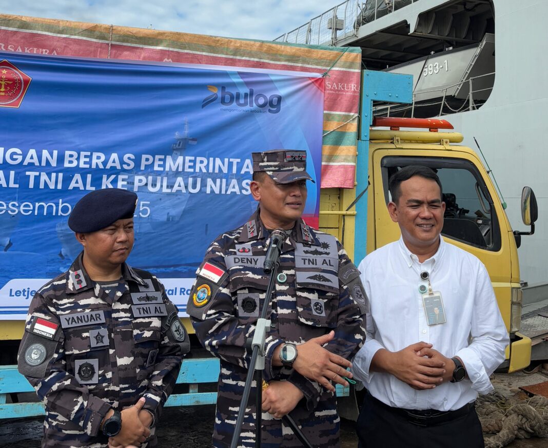 Ket Foto: Petugas TNI Angkatan Laut bersama perwakilan Perum BULOG memberikan keterangan terkait pengiriman Cadangan Beras Pemerintah (CBP) ke Pulau Nias menggunakan kapal TNI AL melalui Pelabuhan Belawan, Jumat (19/12/2025).(Dok.Pelindo)