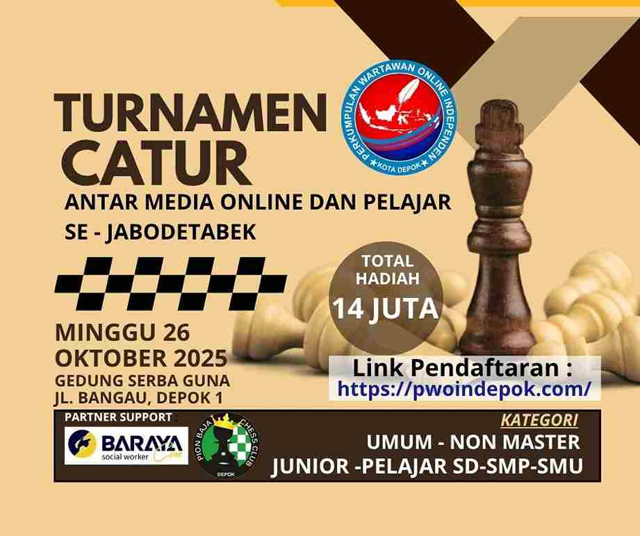 Mudanews.com Depok | Kota Depok menjadi tuan rumah turnamen Catur bergengsi di akhir tahun 2025. Acara yang digagas oleh Perkumpulan Wartawan Online Independen (PWOIN) Depok mempertemukan talenta-talenta olah raga asah otak dan strategi dalam eveng Turnamen Catur antar Media Online dan Pelajar se Jabodetabek.
