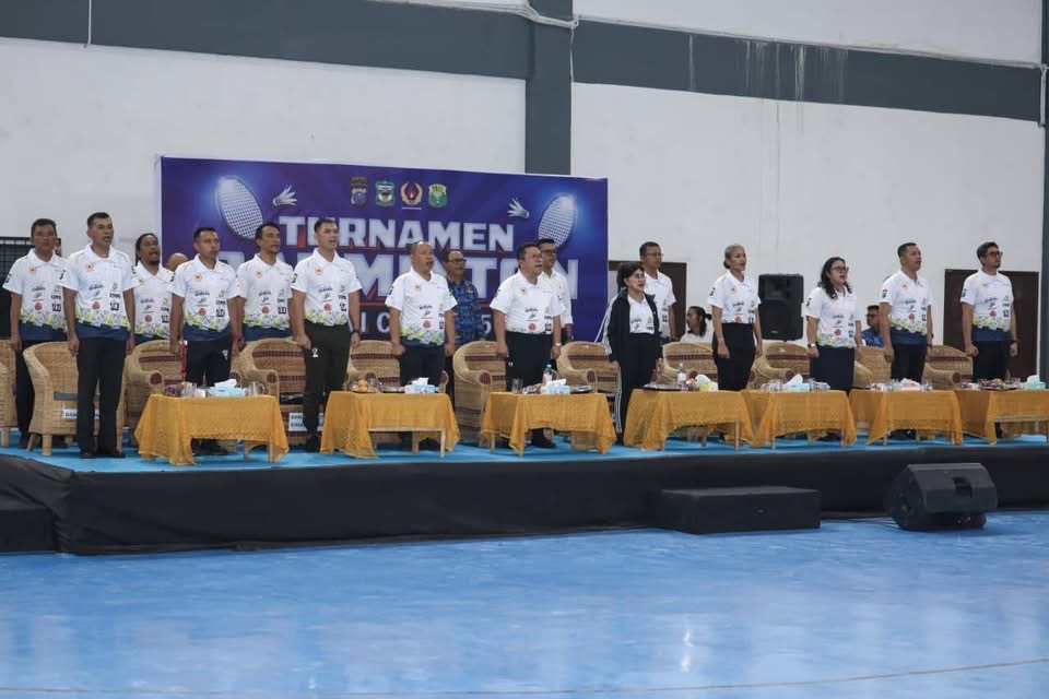 Pembukaan Turnamen Badminton KONI Cup Memperebutkan Piala Kapolres Pematangsiantar Tahun 2025 ditandai servis perdana oleh Wesly bersama Sah Udur, Ny Liswati, dan Unsur Forkopimda.