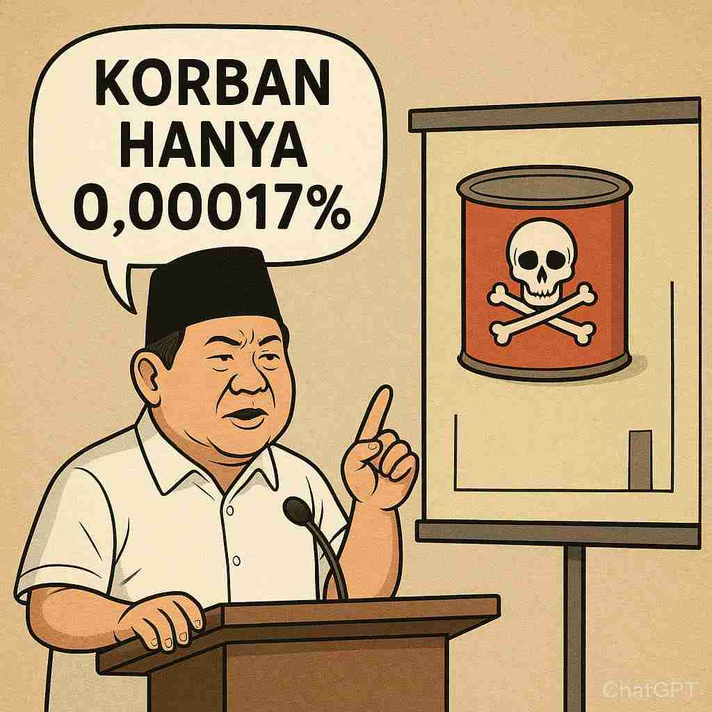 Padahal, satu anak–apalagi satu sekolahan– keracunan akibat makanan yang “diwajibkan” negara adalah indikasi kegagalan atau korupsi sistemik. Bayangkan, jika maskapai Garuda menutupi keteledoran sistem yang berakibat pewat jatuh menewaskan seluruh penumpangnya. Alih-alih mengungkap kesalahan, menteri Perhubungan berdalih dengan angka statistik: “Tenang, penerbangan tetap aman, hanya 0,00017% korban pesawat jatuh dari 30 juta penumpang tahun ini.”