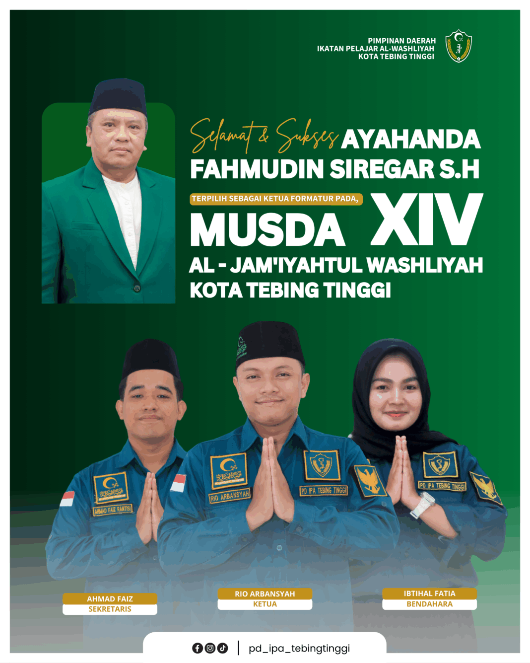 mudanews.com | Tebing Tinggi — Pimpinan Daerah Ikatan Pelajar Al-Washliyah Kota Tebing Tinggi menyampaikan ucapan selamat kepada Fahmudin Siregar, S.H, yang terpilih sebagai Ketua Formatur Al Jam’iyatul Washliyah Kota Tebing Tinggi dalam Musyawarah Daerah (Musda) XIV di Hotel Amanda pada Sabtu, 18 Oktober 2025. (19/10/2025)