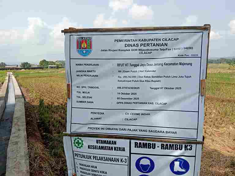 Proyek infrastruktur pertanian senilai Rp. 295.742.000 yang didanai oleh DPPA (Dana Perimbangan Pembangunan Daerah) Dinas Pertanian Kabupaten Cilacap ini ditargetkan selesai pada 05 Desember 2025, setelah dimulai pada 14 Oktober 2025. Proyek ini disambut antusias oleh petani lokal, yang berharap besar pada peningkatan produktivitas hasil panen.selasa