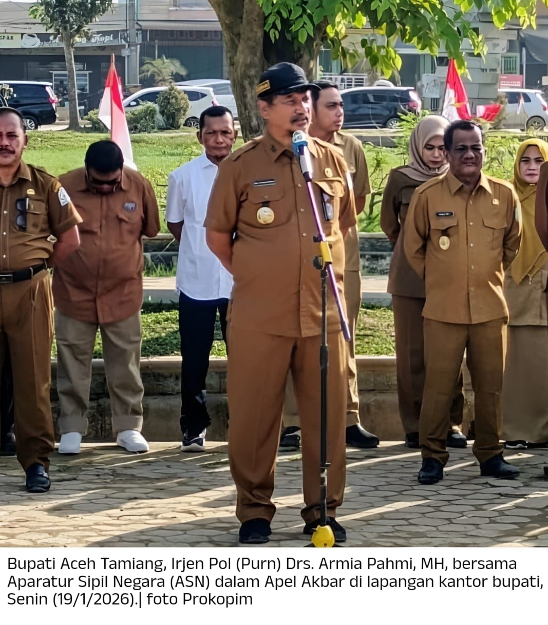 Mudanews – Aceh Tamiang | Mengawali kalender kerja 2026, Bupati Aceh Tamiang, Irjen Pol (Purn) Drs. Armia Pahmi, MH, mengumpulkan seluruh Aparatur Sipil Negara (ASN) dalam Apel Akbar di lapangan kantor bupati, Senin (19/1/2026). Apel ini bukan sekadar agenda rutin, melainkan menjadi momentum konsolidasi besar pascabencana hidrometeorologi yang sempat melumpuhkan aktivitas pemerintahan dan kehidupan masyarakat.