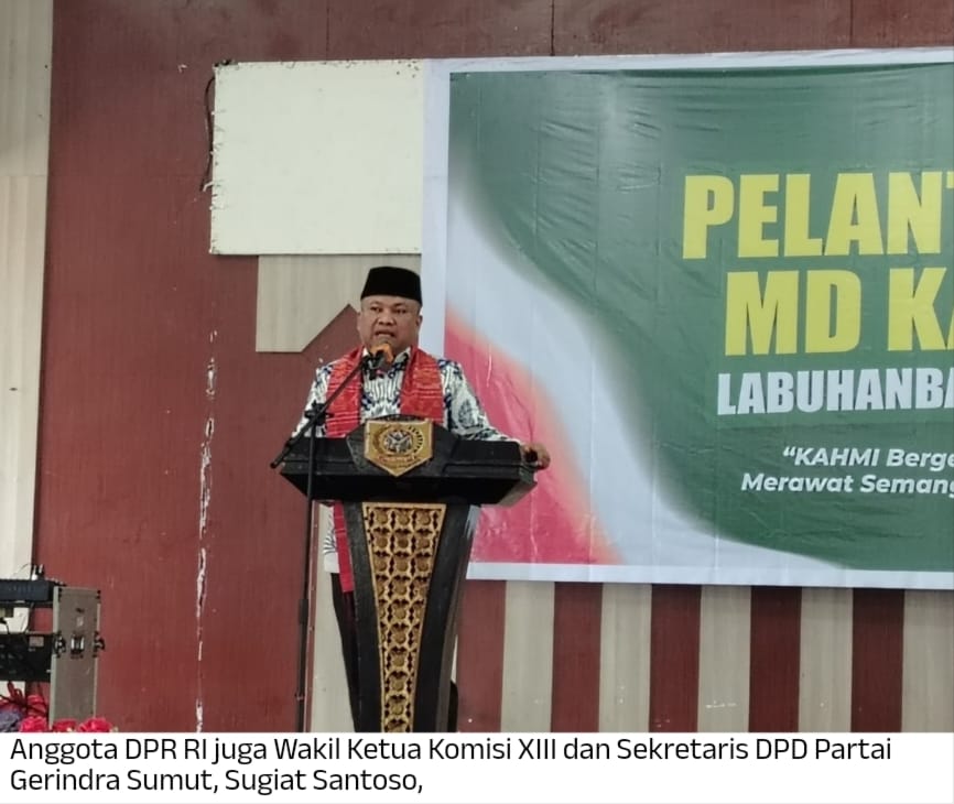 Pada kesempatan yang sama, Anggota DPR RI sekaligus Wakil Ketua Komisi XIII dan Sekretaris DPD Partai Gerindra Sumut, Sugiat Santoso, menyampaikan orasi kebangsaan terkait arah gerak KAHMI ke depan.